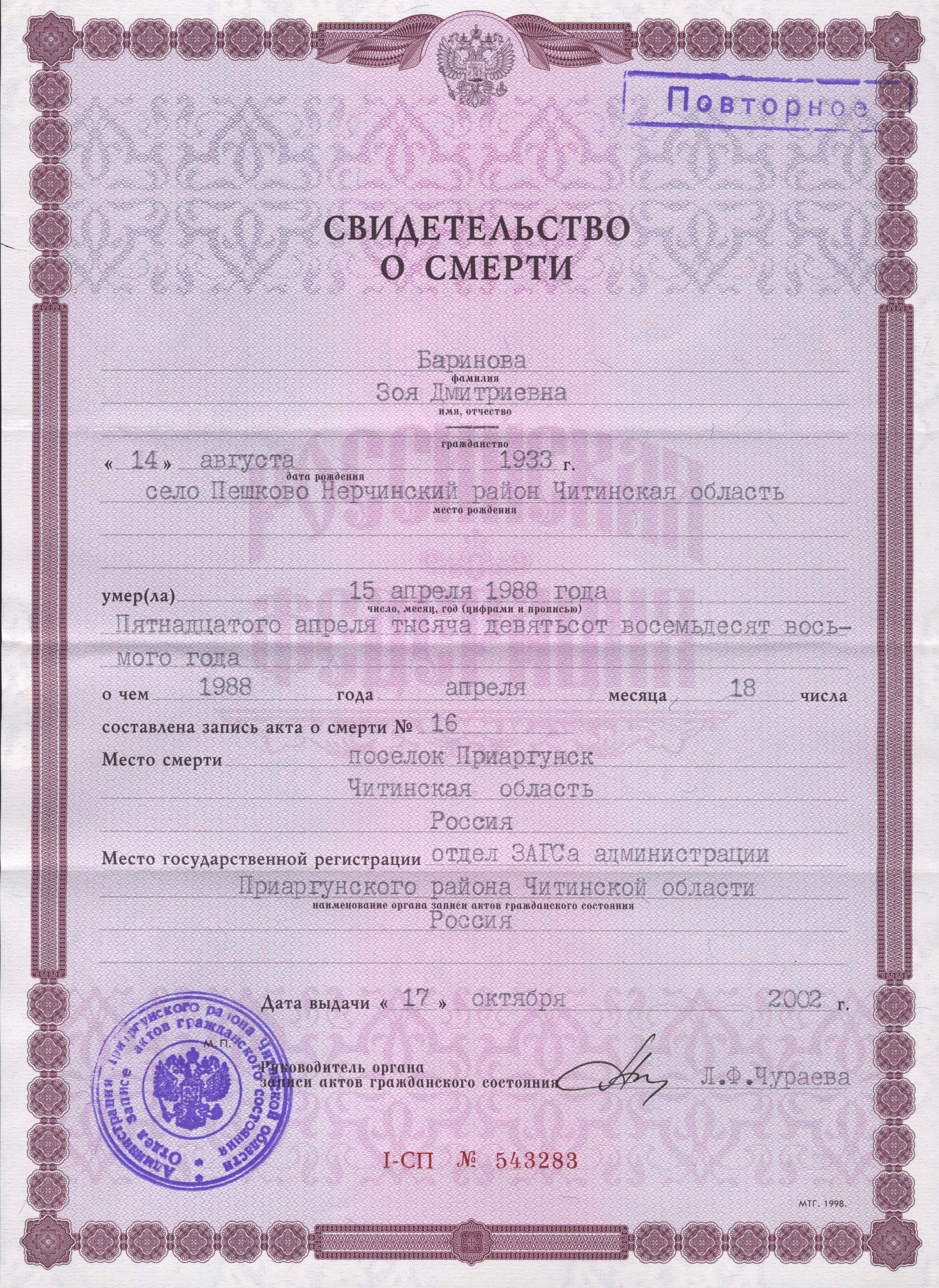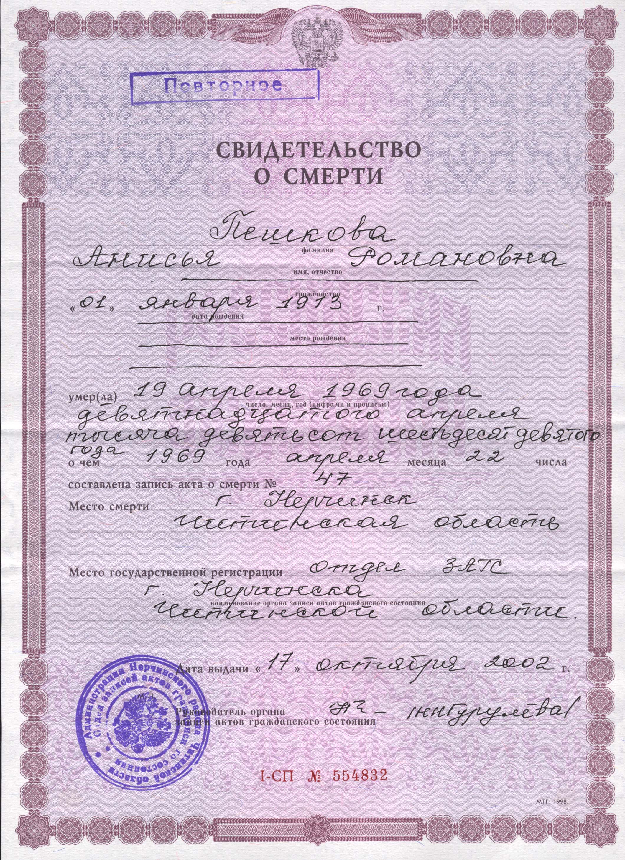 Пешкова Анисья Романовна похоронена на кладбище города Нерчинска Нерчинского муниципального округа Забайкальского края.
