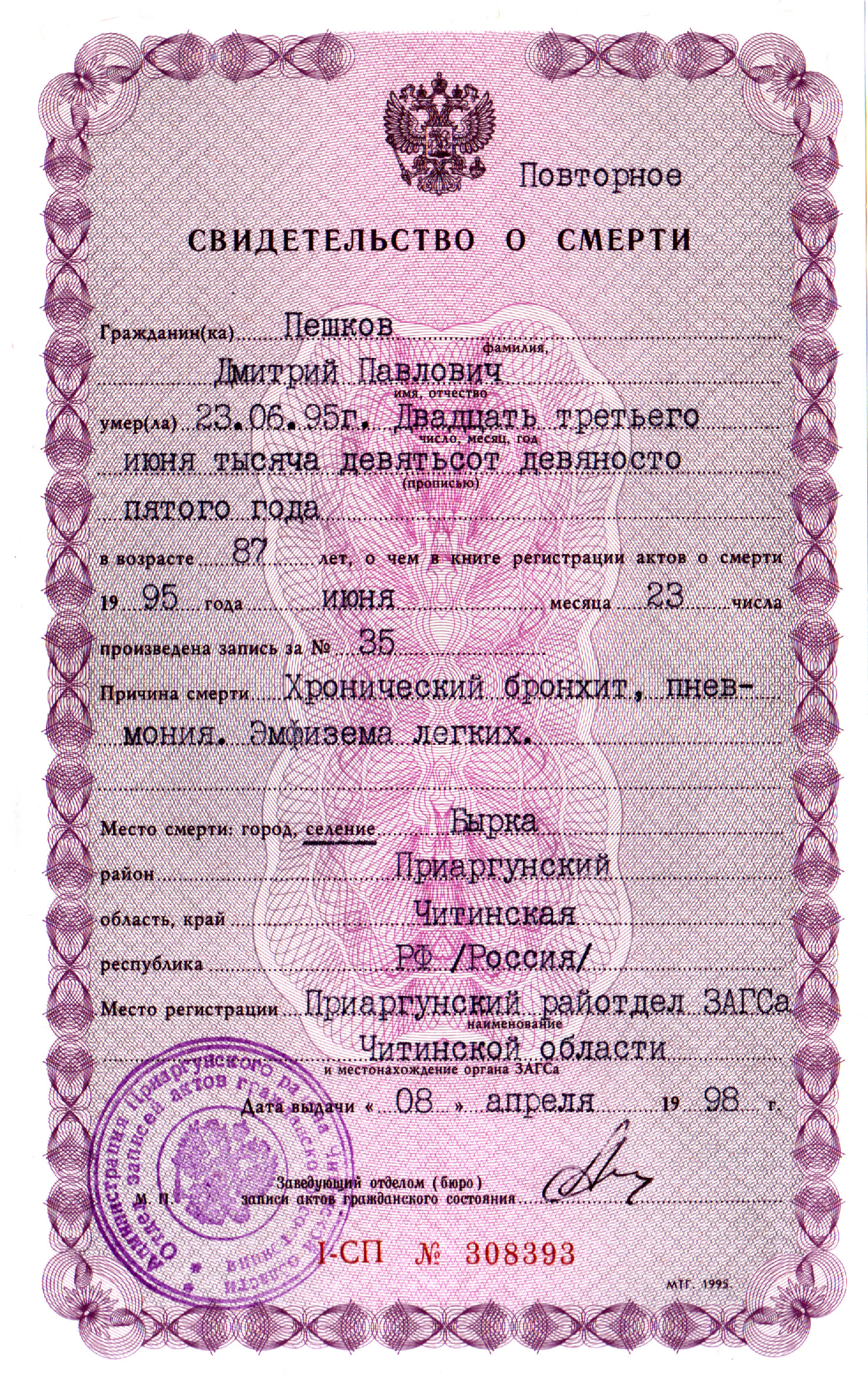 Пешков Дмитрий Павлович похоронен на кладбище поселка Приаргунск Приаргунского муниципального округа Забайкальского края.